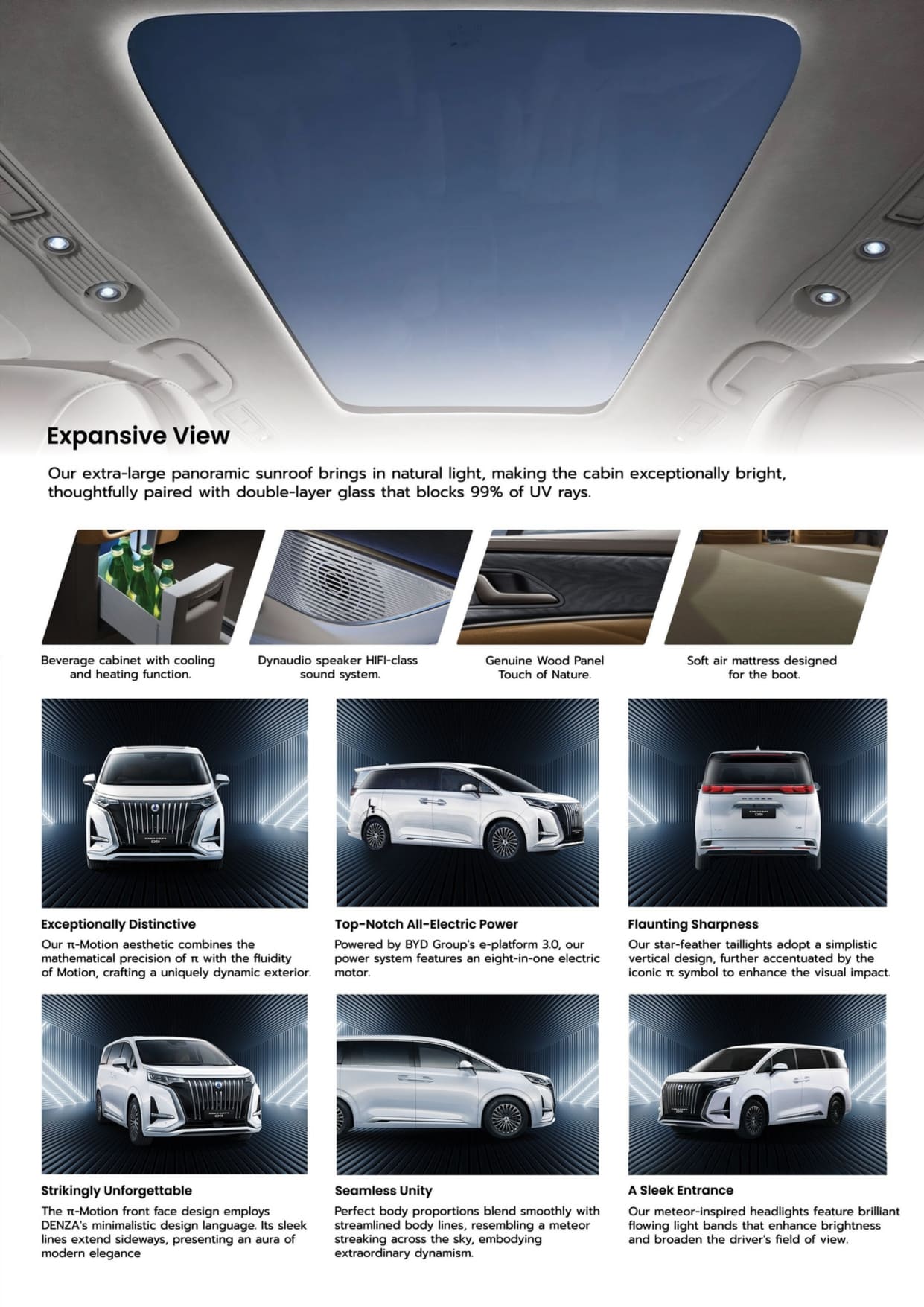 Lampu depan LED yang tajam, grille depan yang stylish, serta body besar yang memberikan kesan kuat dan kokoh menjadikan Denza D9 tampil menonjol di jalanan. Di bagian belakang, Denza D9 juga memiliki desain yang anggun dengan detail yang terintegrasi dengan sangat baik, menciptakan tampilan yang sangat premium.