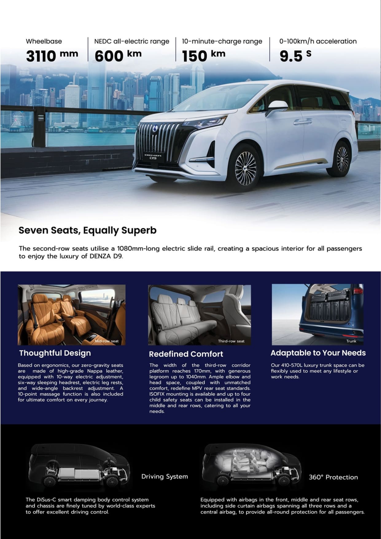 Dengan adanya fungsi pijat yang bisa disesuaikan, perjalanan menjadi lebih menyenangkan dan penuh relaksasi, menjadikan Denza D9 sebagai pilihan sempurna untuk perjalanan keluarga atau bisnis.